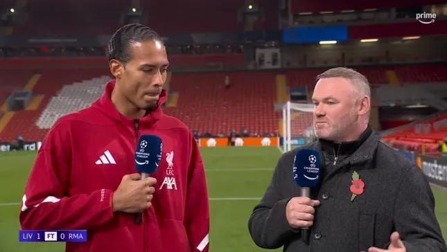 在战胜皇家马德里后,范戴克出来接受亚马逊Prime评论员的采访,而鲁尼正与罗比-福勒、沃尔科特和斯图里奇一起坐在解说席上。